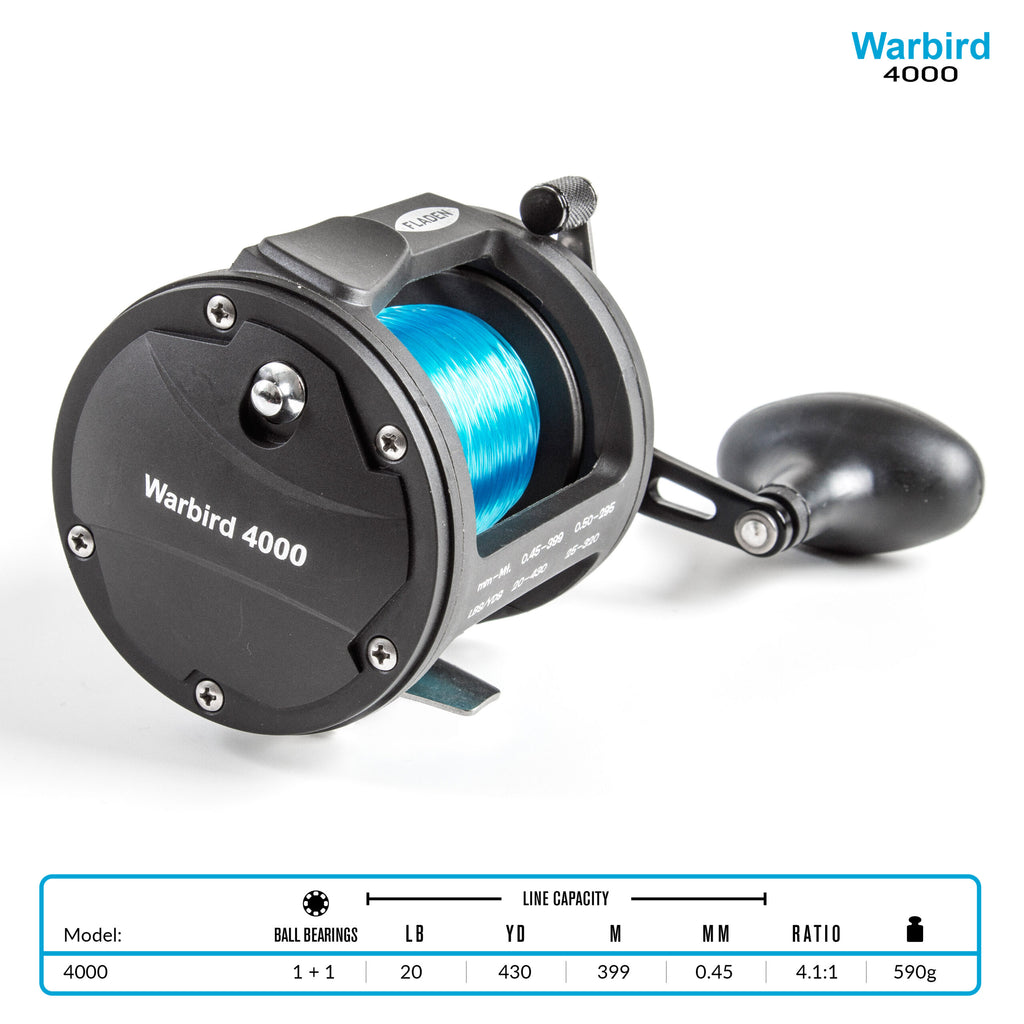 The Warbird 4000 is an impressive boat fishing reel. It features a graphite spool and body, star drag, level wind, auto on/off, comes pre-spooled with line and has many more features