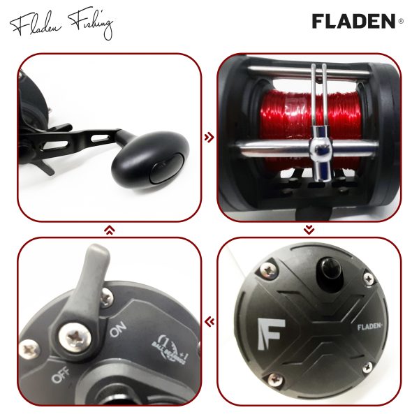 FLADEN WARBIRD boat fishing multiplier reel. Model 3011. Right handed version. Pre-spooled with red 0.60mm/45lb line. Lightweight graphite frame. One way clutch. Line winder/level wind system. 1+1 stainless steel ball bearings. Aluminium handle. Gear ratio 3.8:1.